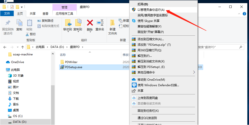 ⑧ 成功删除掉“PD”文件夹里面的文件后,找到之前的安装程序,右键选择“以管理员身份运行”,然后把程序重新安装到“PD”文件夹里面。这个时候一般能解决问题。如果还是无法成功安装,请联系客服。